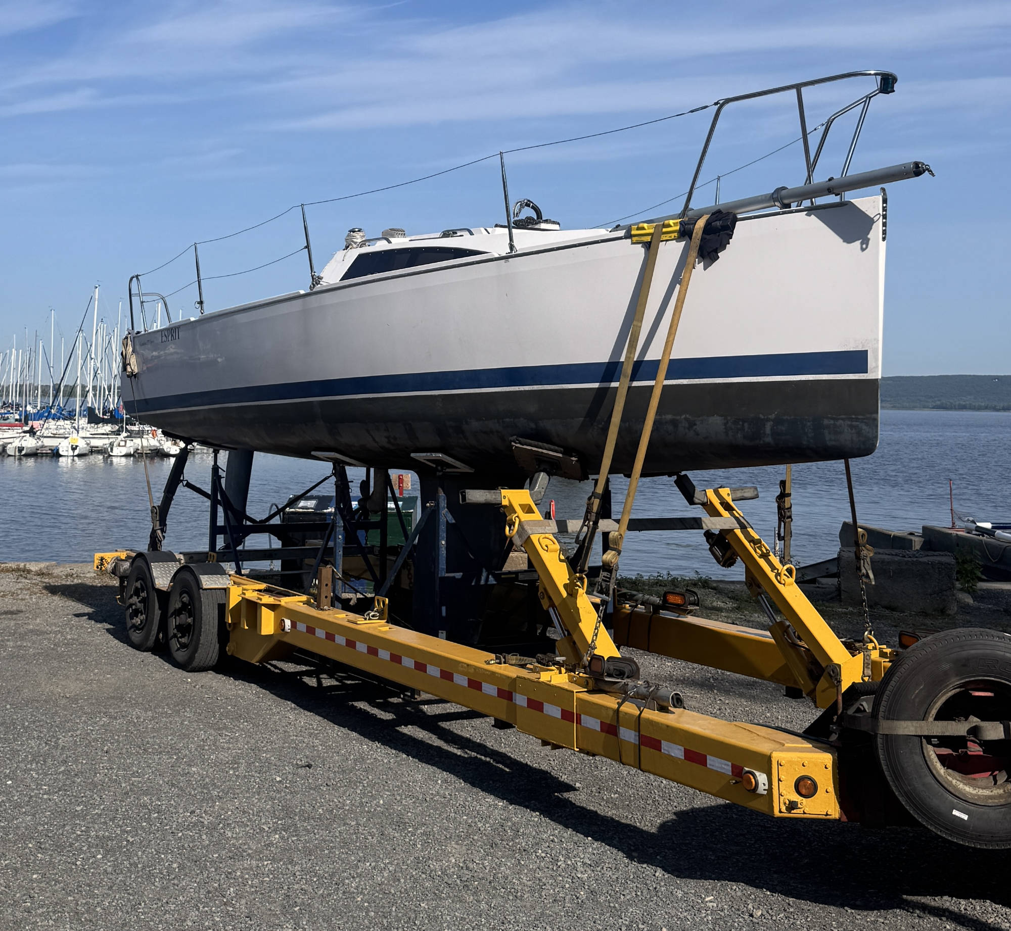 Pour les voiliers, des supports sont installés sous la coque aux endroits appropriés afin d’assurer un maintien optimal durant le transport. Un support latéral est également prévu pour le mât.